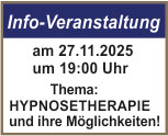 oder in Ihrem persönlichen Umfeld erlebt; Das Leben steckt voller Überraschungen oder Rückschlägen! Lernen Sie, damit richtig umzugehen! Sie wünschen sich neue Energie, Sie möchten Ihr Leben verbessern oder Ihre Lebensfreude zurückgewinnen? Mit dem Rauchen aufhören oder Ihr Gewicht reduzieren? Sie wünschen sich mehr Erfolg im Beruf, beim Sport oder im Privatleben? Mehr Lust auf Vitalität? Bereitet Ihnen der Alltag Probleme? Mit Hilfe der Hypnose und den verschiedenen Verfahren in der Hypnosetherapie, so wie der Quantenheilung und der QHW-3 Methode, können zahlreiche Probleme und Konflikte gelöst werden. Mit einer Hypnosetherapie können Sie Stress abbauen, mehr Selbstbewusstsein und mehr Selbstwertgefühl erlangen, Ihre Selbstheilungskräfte mobilisieren oder Ihr Immunsystem stärken. Geben Sie Ihrem Leben den entscheidenden Schwung! Verbinden Sie das Angenehme mit dem Nützlichen! Hypnose tut nicht weh .... im Gegenteil, Sie genießen den Zustand der absoluten Entspannung und so ganznebenbei erhalten Sie die Suggestionen für Ihr Wohlbefinden oder für Ihre Problemlösung. Die Hypnosetherapie bietet sehr viele Möglichkeiten, Ihre Gesundheit um das Vielfache zu verbessern. Mit mehr Lebensfreude und Lebensqualität finden Sie wieder Sinn in Ihrem Leben. Wichtig für Ihren Erfolg: Keine Gruppensitzungen! Jede Hypnosesitzung bei mir ist eine individuelle Einzelsitzung! Jede Hypnosesitzung geht so lange wie sie gehen muß (keine Zeitbegrenzung). Einer braucht nur eine Stunde oder ein anderer benötigt etwas mehr Zeit. Der Typ von Mensch und die Thematik spielen dabei eine große Rolle. Aber egal wie lange die Sitzung dauert, das vereinbarte Honorar bleibt immer gleich! Für ein unverbindliches Informationsgespräch stehe ich Ihnen gerne zur Verfügung. Hypnose ist eine Sache des Vertrauens. Diskretion, Vertrauen und Seriosität stehen bei mir an erster Stelle. Schon allein aus diesem Grund ist bei mir das Vorgespräch kostenlos und unverbindlich! Die angegebenen Preise sind Festpreise. Für länger dauernde Gespräche oder Sitzungen entstehen keine Mehrkosten! Profitieren SIe von meiner über 25 jährigen Berufserfahrung! Für Informationen und Termine rufen Sie mich gerne an unter: 038722 - 489975 |